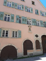 | Runde Tür- und Torbogen im Erdgeschoß und rechtwinklige Fenster in den Stockwerken eins bis vier kennzeichnen die Fassade des Erckenbrechtschen Hauses in Rottenburg am Neckar. |