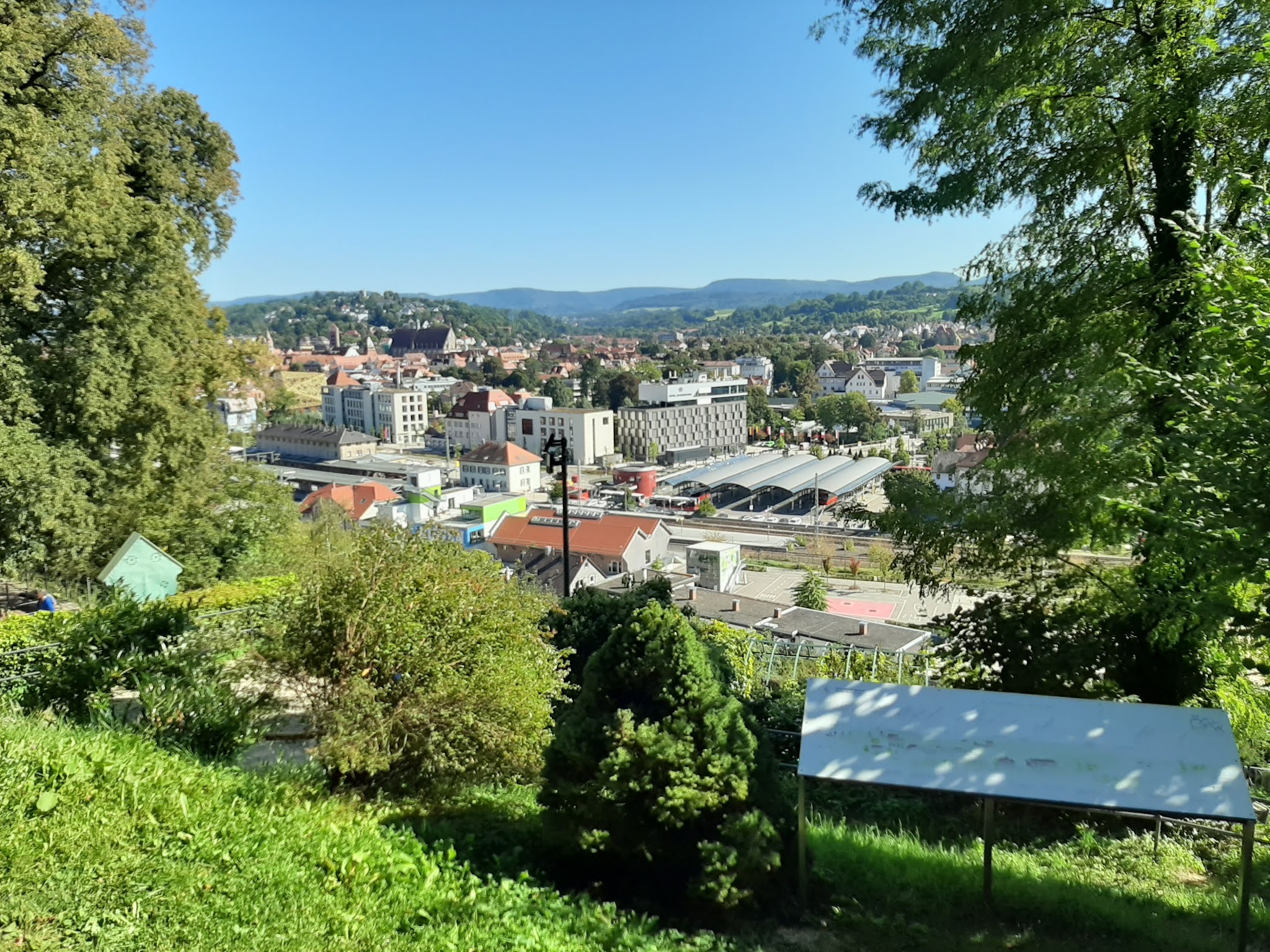 | Blick von St. Salvator in südöstliche Richtung: Man sieht den Bereich um den Bahnhof von Schwäbisch Gmünd mit den Dächern des Zentralen Omnibusbahnhofs. |